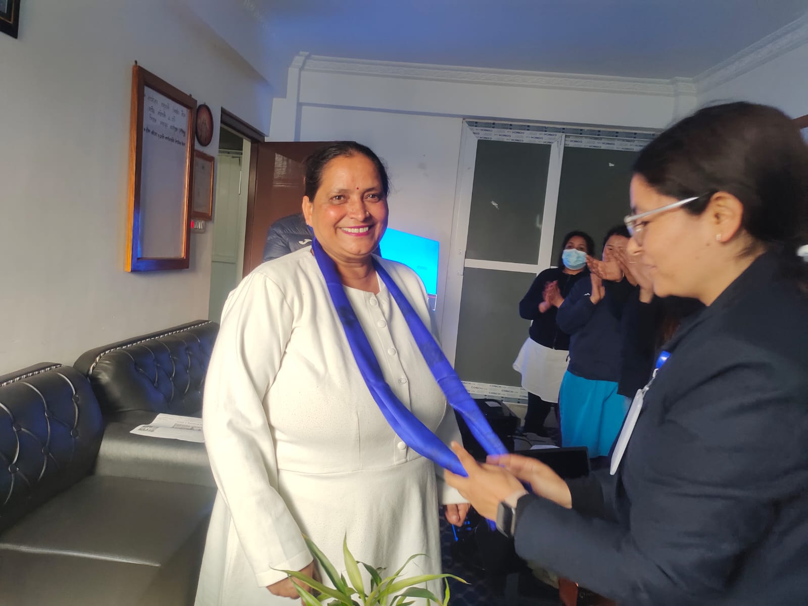 आयुर्वेद तथा वैकल्पिक चिकित्सालयका प्रमुख, कन्सल्टेण्ट आयुर्वेद विज्ञ डा. पुनम नेपाललाई कार्यालयमा स्वागत गर्दै